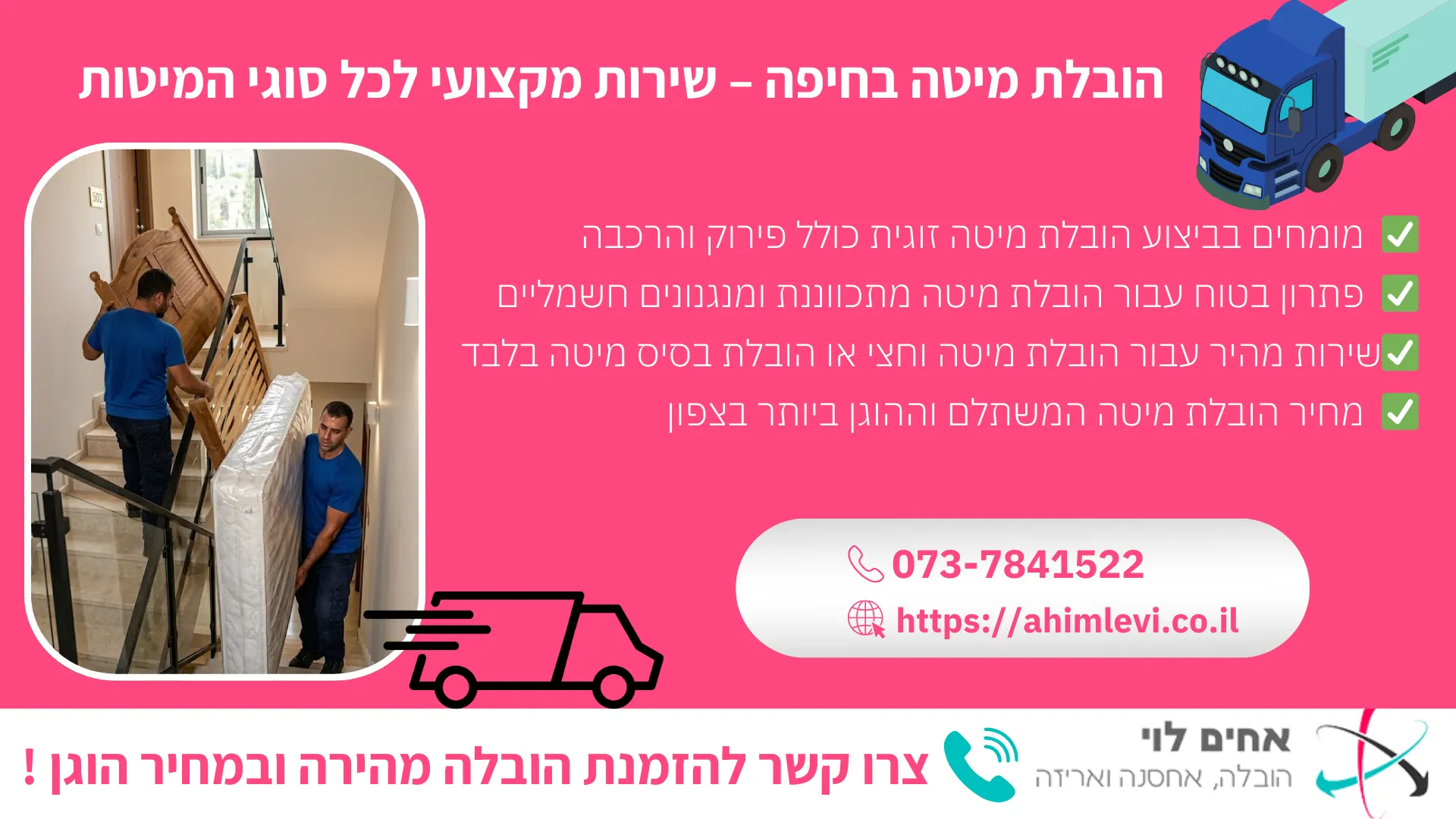 מעבר דירה הוא אחד האתגרים המורכבים ביותר שאנו מתמודדים איתם, והמיטה היא בדרך כלל אחד מפריטי הריהוט הגדולים והמסורבלים ביותר שדורשים תכנון והתארגנות מיוחדים. הובלת מיטה איננה משימה פשוטה – היא דורשת ידע מקצועי, ציוד מתאים, וניסיון רב כדי להבטיח שהמיטה תגיע ליעדה בשלמות וללא נזקים. בחברת אחים לוי הובלות, המובילה בתחום הובלות בחיפה מאז 1985, אנו מבינים את החשיבות של הובלה מקצועית ובטוחה, ומספקים פתרונות מותאמים אישית לכל סוג של מיטה ולכל מצב הובלה. עם למעלה מ-35 שנות ניסיון, ביטוח תכולה מלא עד 50,000 דולר, וצוות מיומן ומקצועי, אנו מבטיחים שהמיטה שלכם תועבר בצורה הבטוחה והיעילה ביותר.